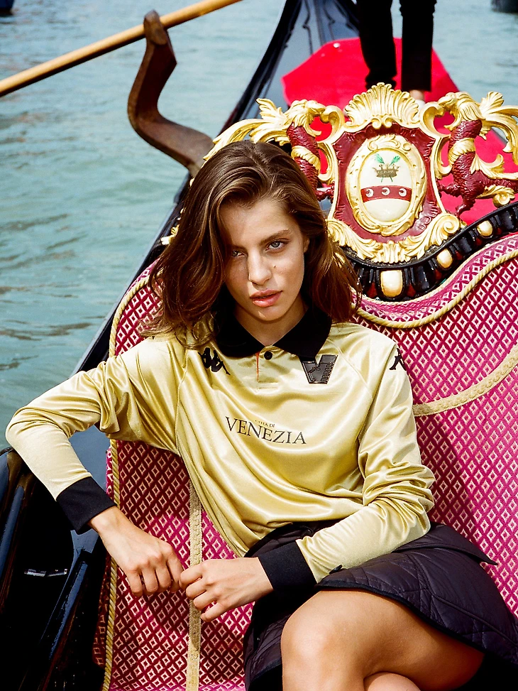 Представляет новинку греческая модель Теописти Пурлиотопулу – в золотой футболке завтракает на берегу канала, сидит в уличном кафе и катается на гондоле. Вот она: