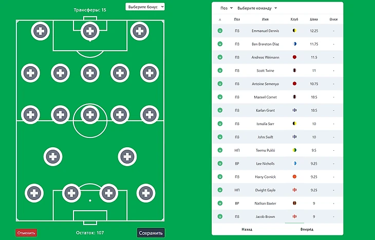 Вот так выглядит страница сбора команды. Вам дан бюджет в 107 условных единиц, чтобы выбрать 15 игроков.
