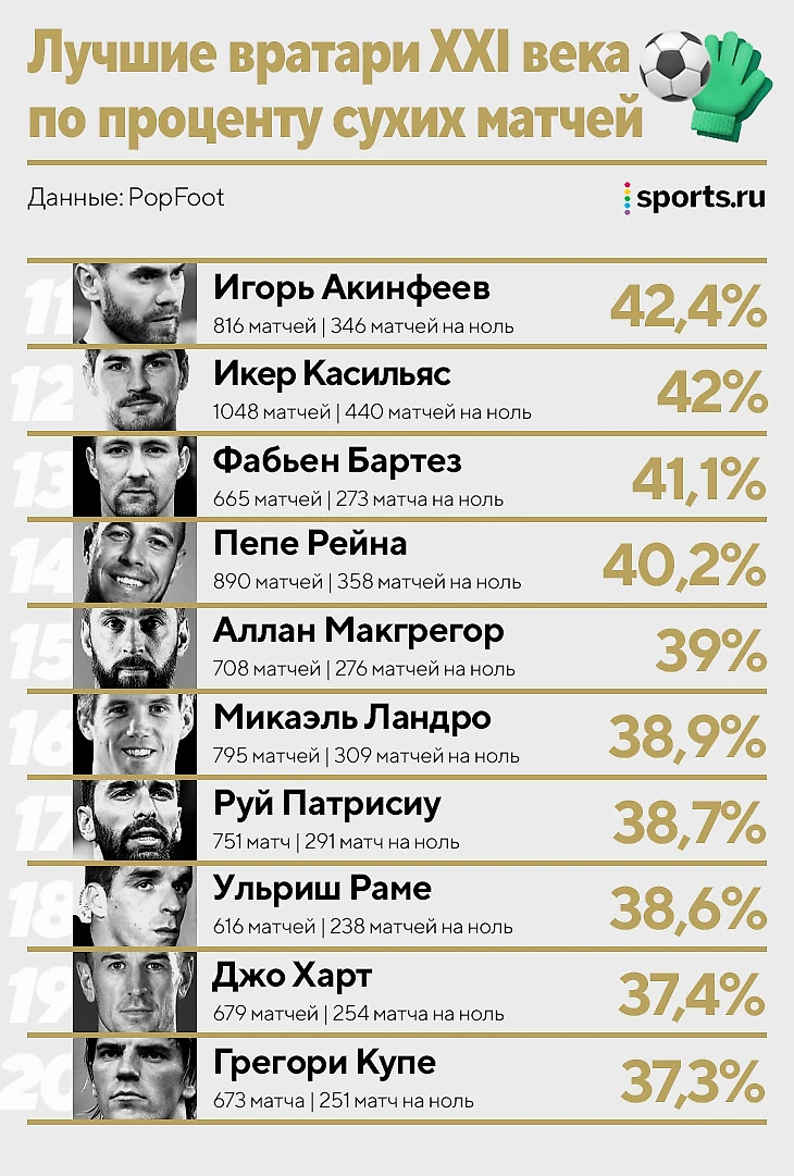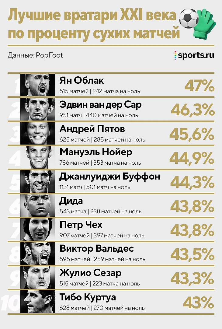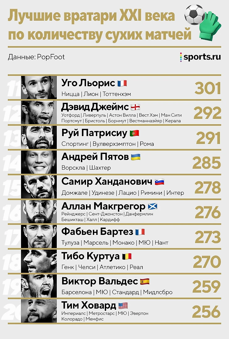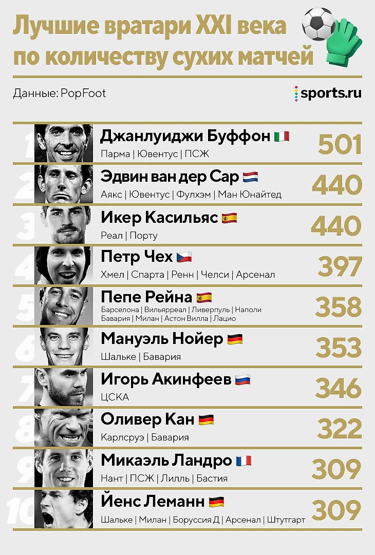 И теперь новая подборка – топ вратарей по количеству сухих матчей.