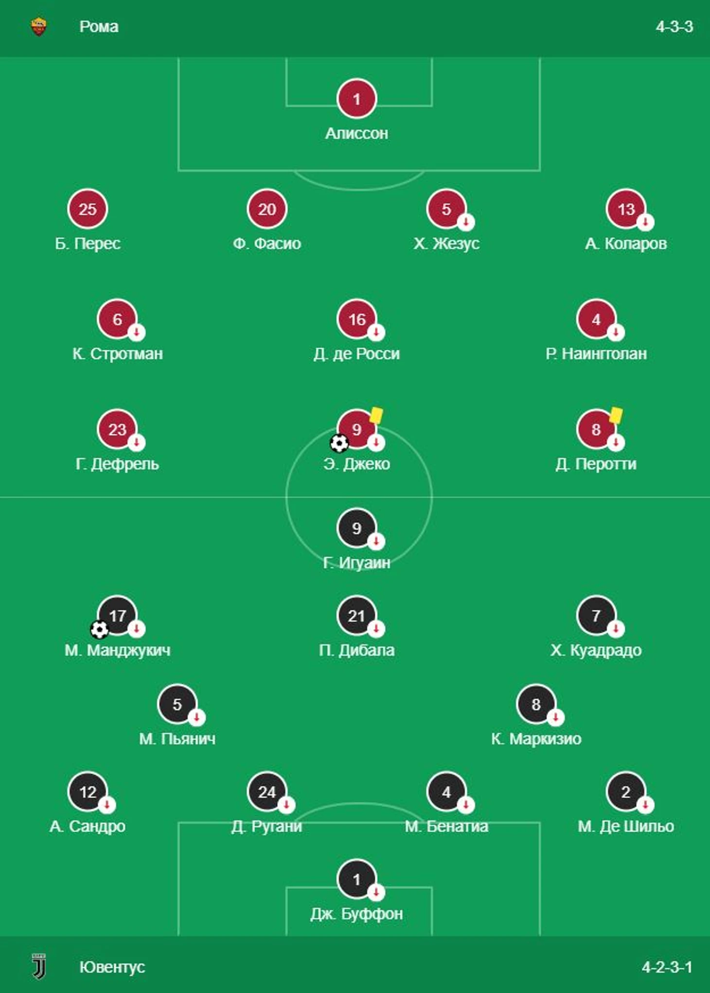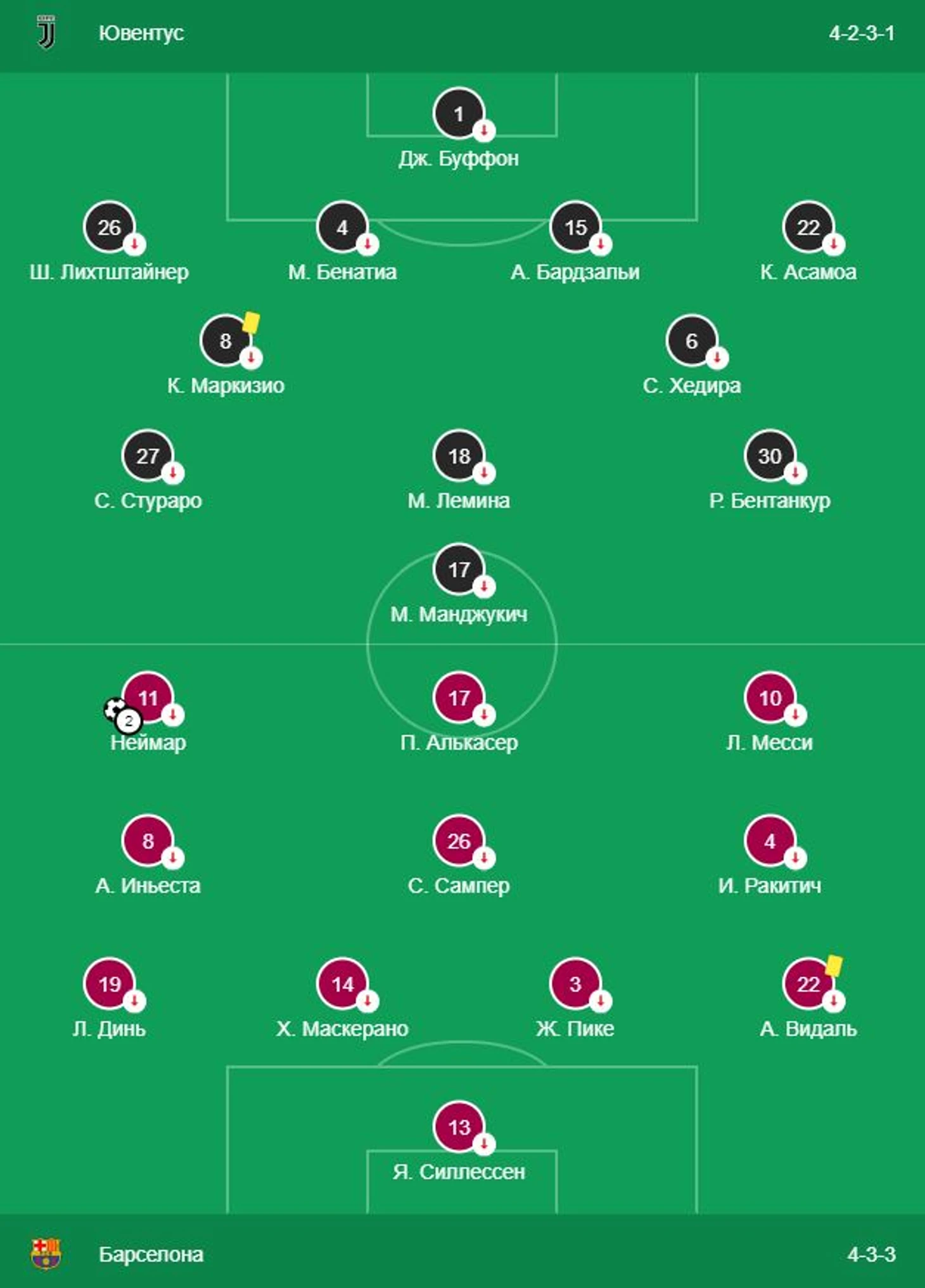 С обеих стороны присутствовали почти полностью основные составы и рабочие схемы. Аллегри и тут оставался верен себе и не отходил от своих базовых принципов понимания структуры футбола, в который должен играть Ювентус - отдаем мяч, обороняемся, отбираем и убегаем в контратаку.