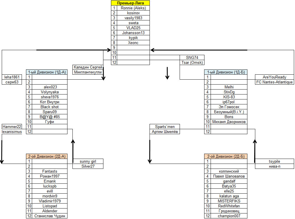 Производя горизонтальные перемещения в рамках каждого из Дивизионов между 3-ми, 5-ми, 7-ми и 9-ми местами, получаем окончательный состав Лиг и Дивизионов: