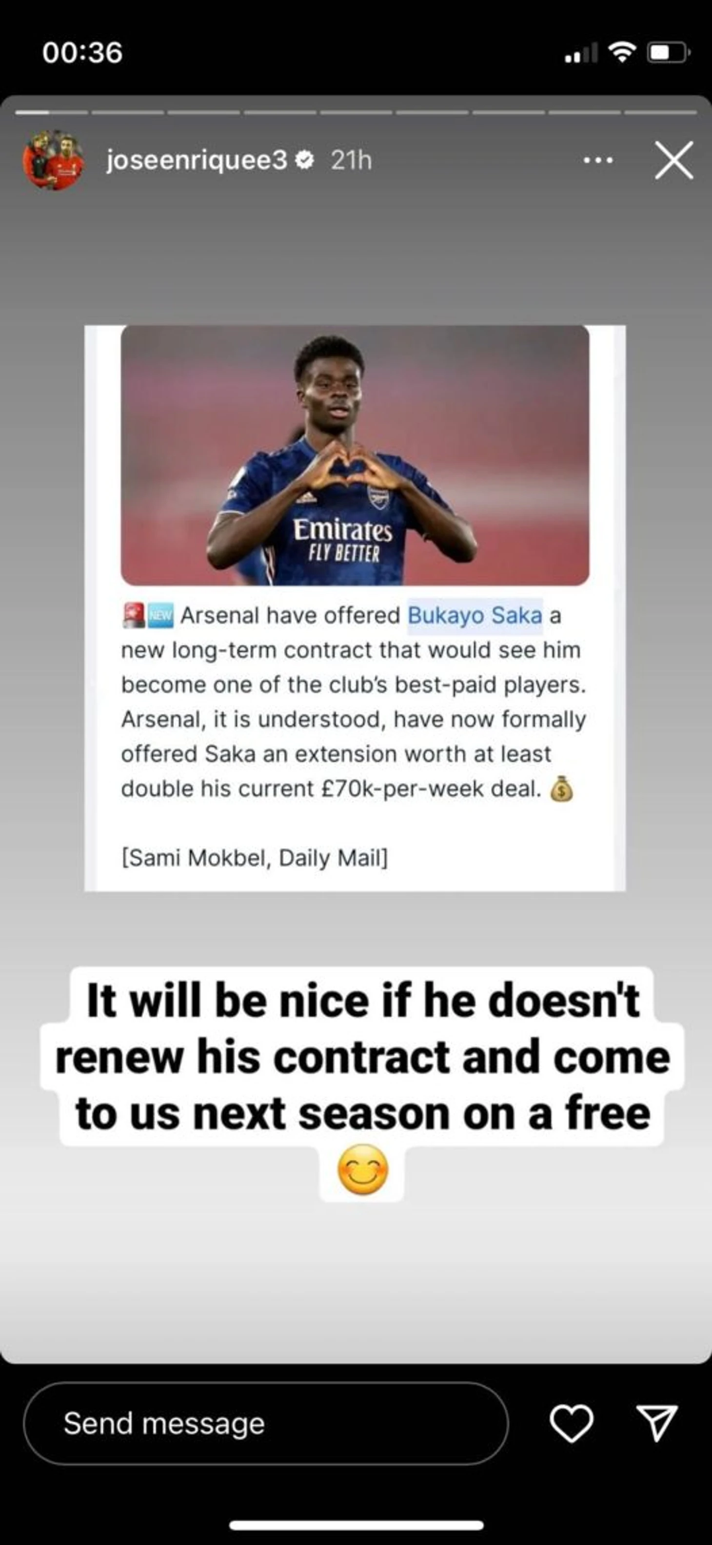 Испанец скопировал в сториз новость о контракте Букайо Сака и написал следующее сообщение: «Было бы неплохо, если бы ты не продлил контракт и перешел в «Ливерпуль» бесплатно».