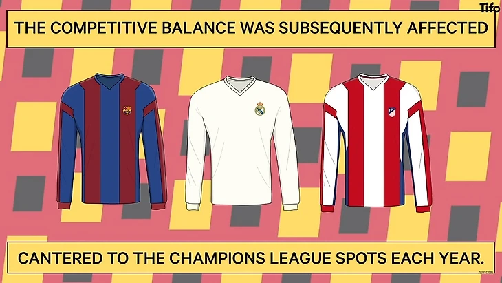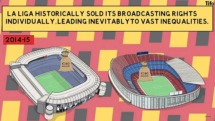 Напротив, клубы Ла Лиги продавали свои права на телевещание по отдельности, что неизбежно приводило к огромному неравенству. Например, в 2014–2015 годах Реал Мадрид и Барселона получили 140 миллионов евро от индивидуально проданных телеправ по сравнению с жалкими 18 миллионами, полученных Альмерией. Впоследствии, соревновательный баланс был нарушен и Барселона, Реал Мадрид и Атлетико Мадрид достигали невероятных успехов в еврокубках.