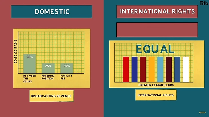Международные права (до недавнего времени) разделялись поровну между всеми конкурирующими клубами Премьер-лиги. Такой агрессивный метод перераспределения означал, что лучшая команда редко получала более чем в 2,5 раза больше, чем низшая команда. Принцип равенства был реализован в полной мере.