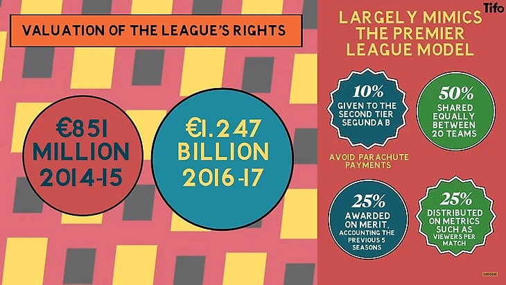 Новая система распределения доходов в значительной степени имитирует модель английской Премьер-лиги — хотя 10% дохода от телеправ выплачивается Сегунде, чтобы избежать "парашютных выплат", при этом 50% доходов от телеправ Ла Лиги делится поровну между 20 командами, а 25% распределяются на основе заслуг, с учетом предыдущих пяти сезонов, и 25% распределяется по такому показателю, как количество зрителей, посмотревших футбольный матч. Это вдвое сократило разрыв в доходах от телетрансляций между лучшими и худшими командами, и было выражено в пропорции, с 8:1 до 4:1.