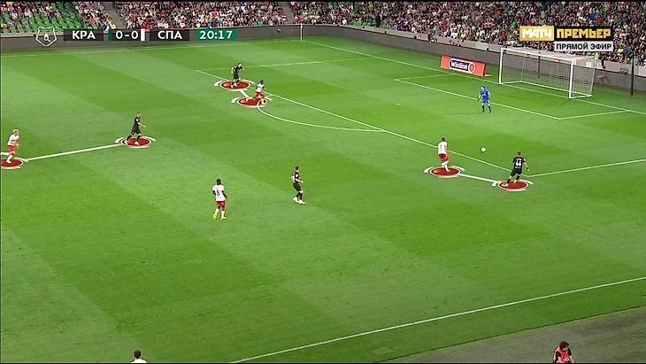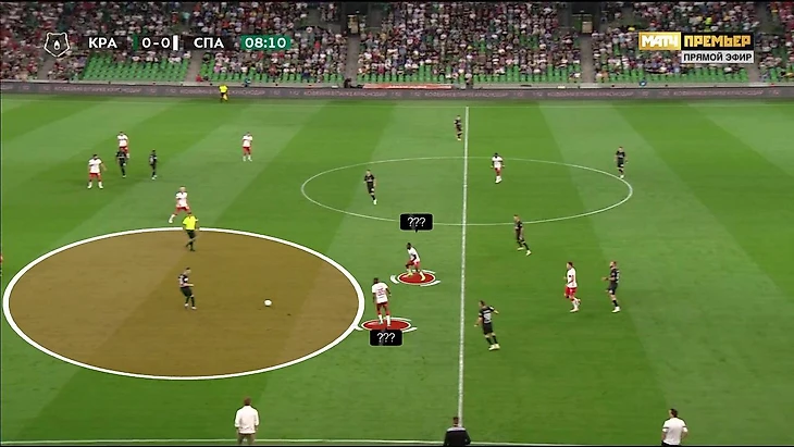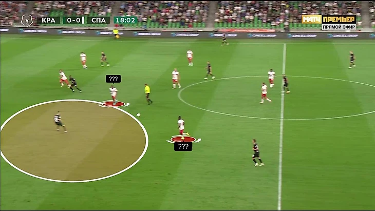 «Краснодар», как и «Спартак», не оказывал прямого давления на центральных защитников – Кордоба играл по Литвинову. Узкими позициями фланговых нападающих (Олусегун чаще оказывался слева, Ионов – справа) «Краснодар» освобождал фланги – например, при начале атак «Спартака» Даниил Денисов почти всегда оставался без соперника.