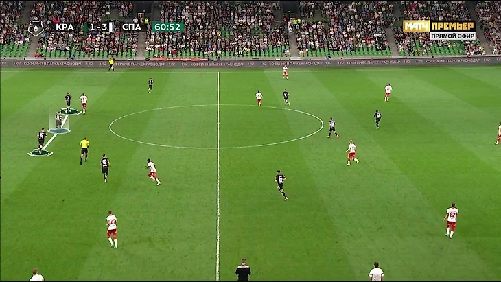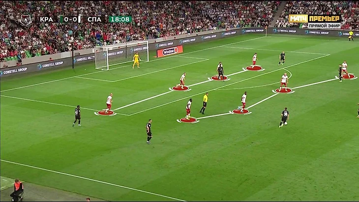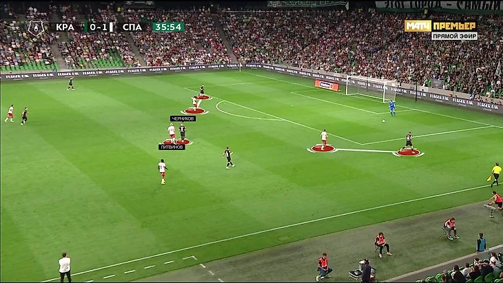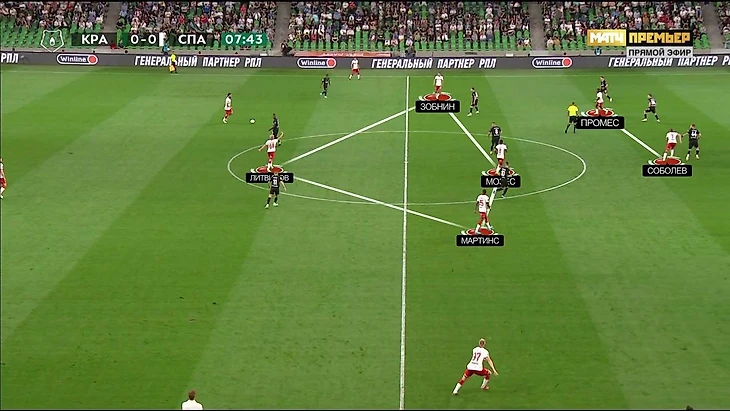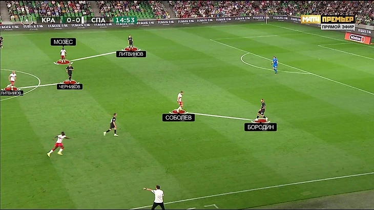 В первую очередь за него отвечал Литвинов. Соболев и Промес разбирали центральных защитников «Краснодара» (при этом не оказывая реального давления, когда те были с мячом, а скорее мешая беспрепятственному протаскиванию мяча к центру поля), а Литвинов поднимался на чужую половину за опорником «Краснодара» Александром Черниковым.