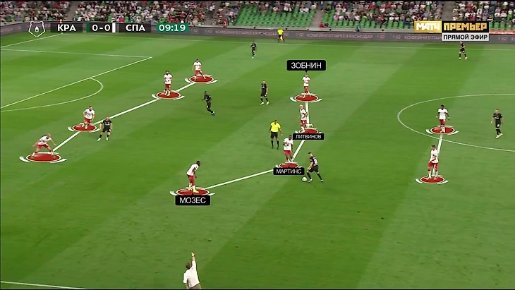 «Спартак» использовал гибрид, важнейшей деталью которого стал Мозес. При долгих позиционных атаках «Краснодара» москвичи переходили на классические 4-4-2, где Мозес закрывал правый фланг полузащиты, Зобнин – левый, а Мартинс и Литвинов составляли пару в середине поля.