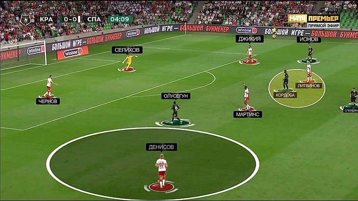 Медленное принятие решений с мячом и нежелание играть на свободного партнера дважды могло привести к большим проблемам для «Спартака». Сначала Кордоба пошел в прессинг до Селихова, и «Краснодар» отобрал мяч у чужой штрафной (но Кордоба нарушил правила), а затем Кордоба обокрал Руслана Литвинова после плохого паса Чернова, и хозяева выбежали 3-в-2.