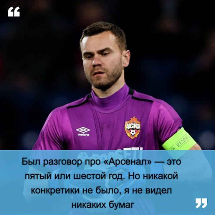 Акинфеев заявил в разговоре с Дмитрием Сычевым и Денисом Казанским, что никогда не пользовался услугами агентов, советуясь только с президентом ЦСКА Евгением Гинером. Инсайдер Иван Карпов в 2020-ом году выдал новость для Metaratings, согласно которой босс «красно-синих» и вправду получил предложение по Игорю от «Арсенала», но запросил 25 миллионов евро за трансфер. Англичане же настаивали на сумме не более 15 миллионов евро.
