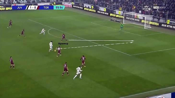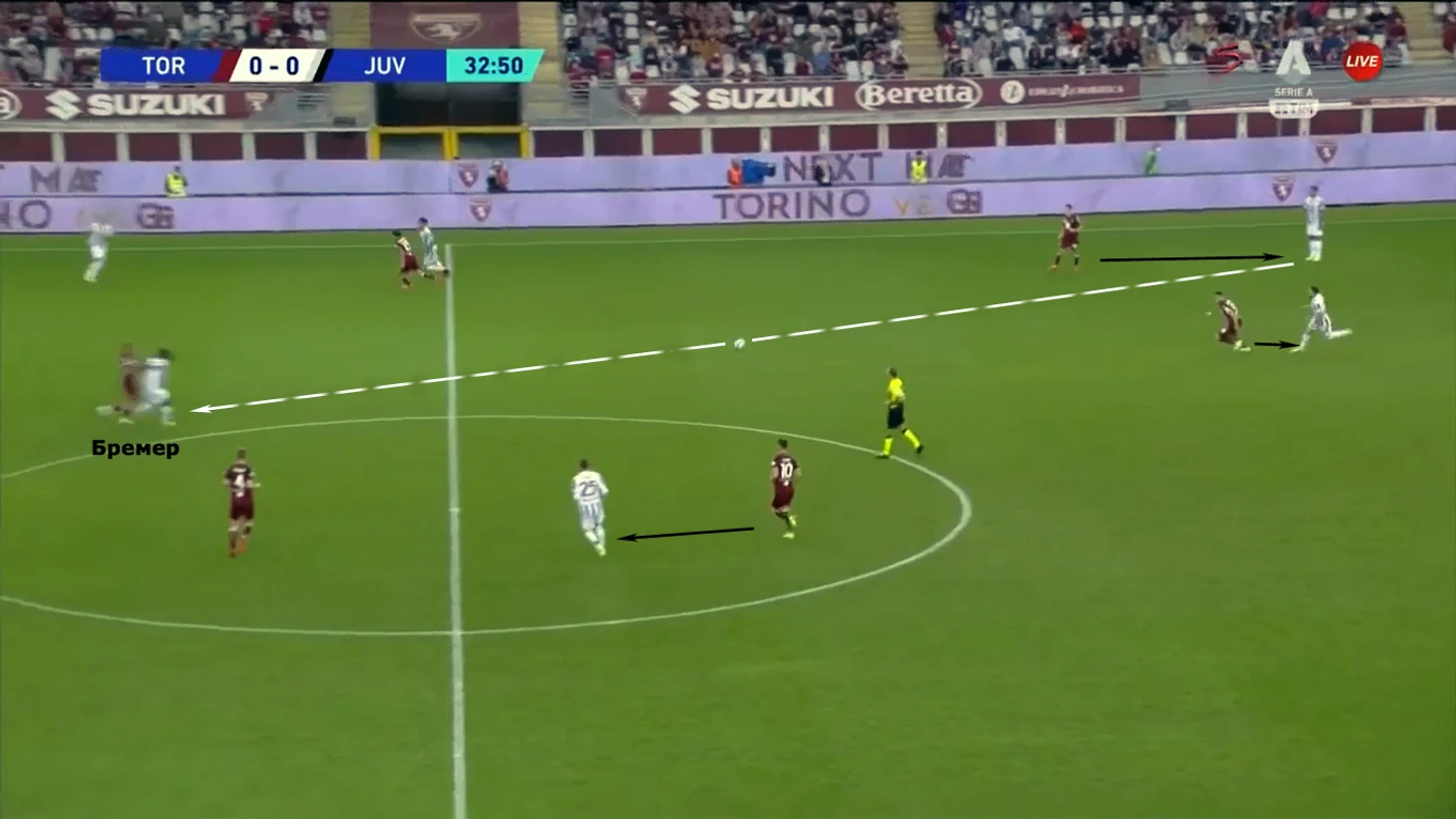 Иначе говоря, Бремер не Демирал – умеет выдержать паузу. Вот еще один показательный момент из игры с «Юве». Здесь бразилец держит линию и стережет Влаховича, который угрожает забегом за спину, и заодно приглядывает за врывающимся в свободную зону Маккенни. Закария пасует на американца, и защитник тут же занимает идеальную позицию – перекрывает коридор паса и траекторию движения. В конце он выдавит Уэстона и накроет бесперспективный удар.