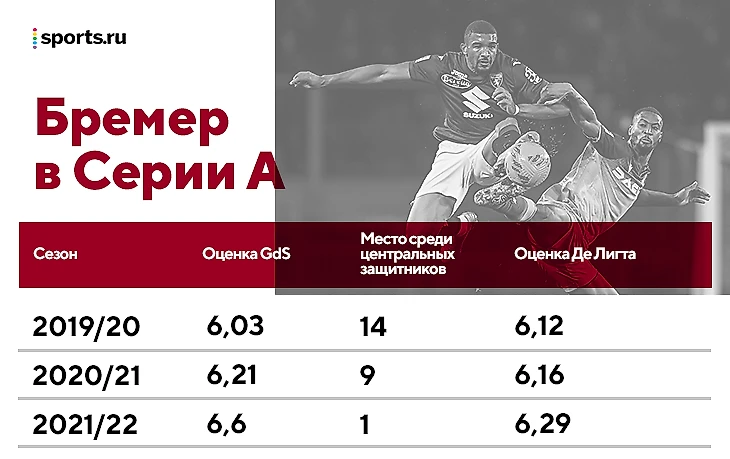Еще один ракурс для восхищения – средняя оценка Gazzetta dello Sport. Бремер стал третьим в лиге и лучшим среди защитников, но впечатляет другое. Его 6,6 балла – рекорд. Ни один центрбек за последние 10 лет (отрезок, по которому есть данные) не достигал таких цифр. Даже пиковые Кулибали и Кьеллини останавливались ниже.