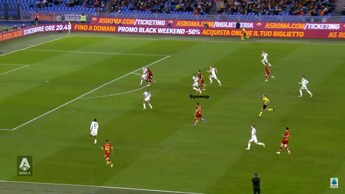 2. самое важное: Бремер плохо контролирует игрока за спиной, особенно при движении назад – например, в контратаках. Он поздно реагирует на рывок, пускает нападающего в пространство и иногда вообще забивает на последствия – не бежит следом, потому что уверен, что уже не догонит. Ниже – эпизод из игры с «Ромой»: бразилец так явно проспал ускорение Дзаньоло, что даже смотрел в другую сторону.