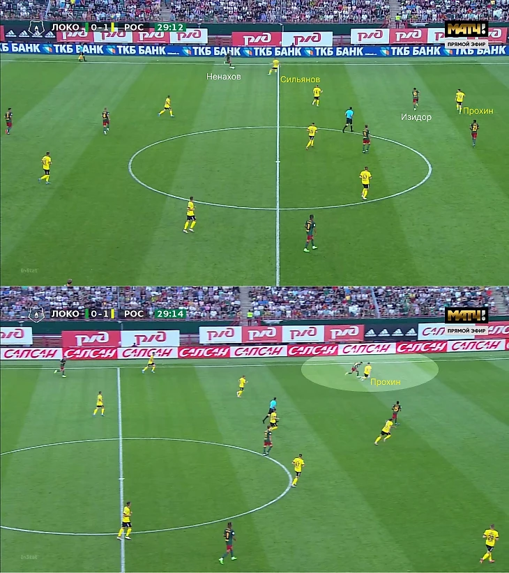 Как итог – свободная зона слева, вынужденный рывок Сильянова наверх и быстрый Изидор 1-в-1 с Прохиным.