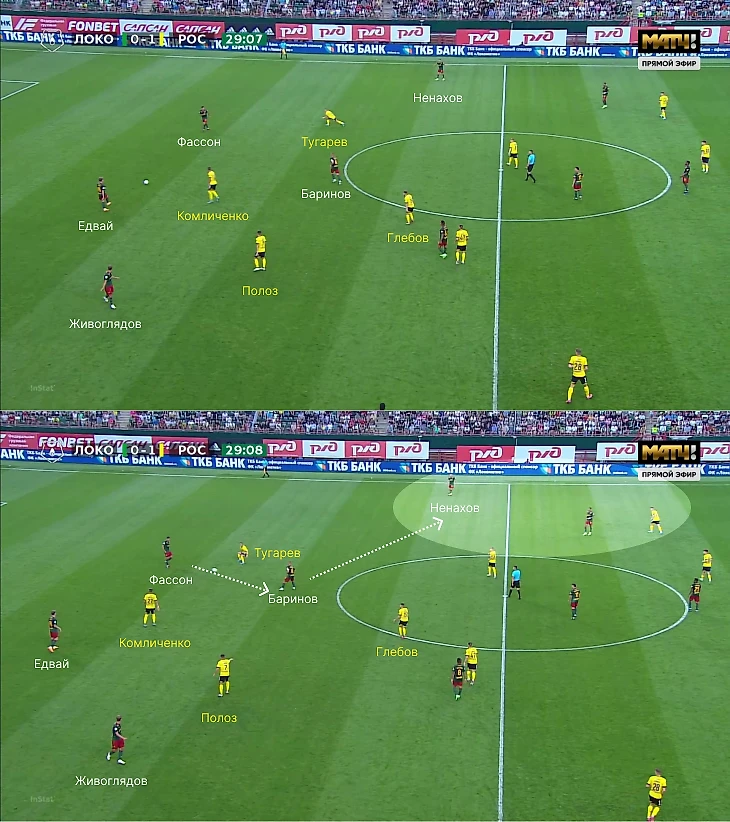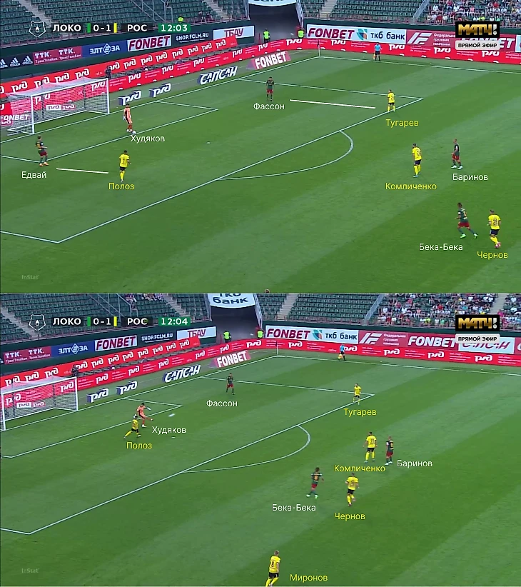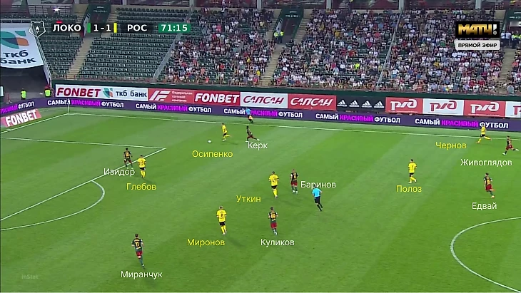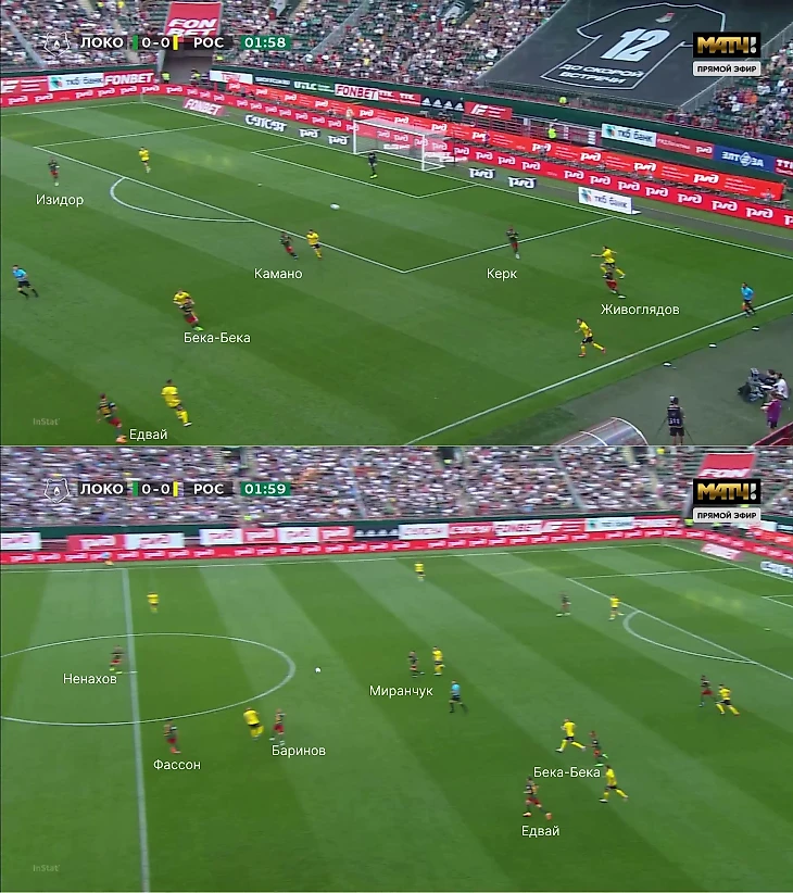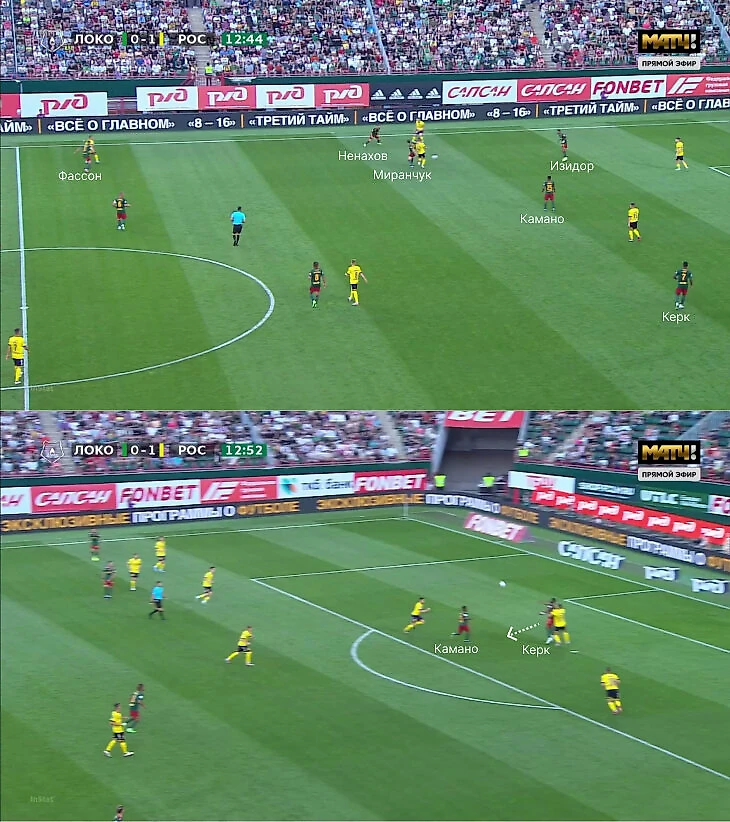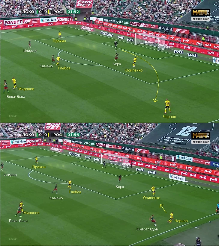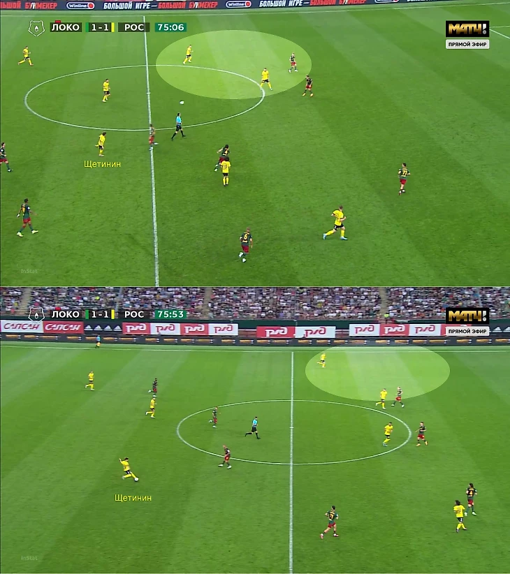 Однако зачастую высокая линия защиты «Локо» открывала возможности перед «Ростовом» – команда Карпина попала в схожие условия, что и с «Динамо», когда появилось пространство для переводов на свободные фланги (в основном за такие передачи отвечал Щетинин).