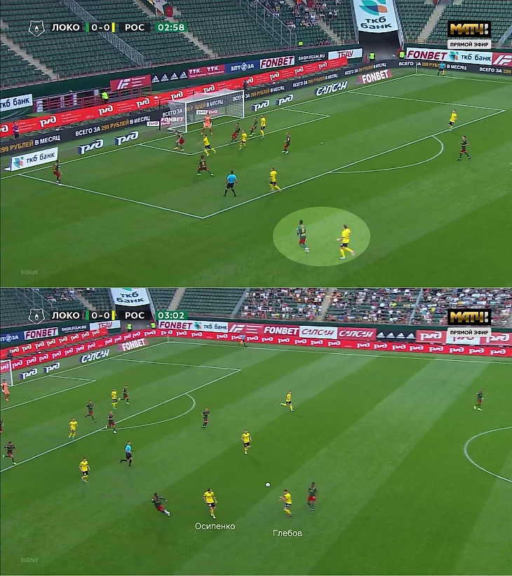 Эпизодов было немного, а записей с тактической камеры нет, из-за чего ход сложнее оценить, но, вероятнее всего, «Ростов» рассчитывал персонально разобрать всю команду при переводе на фланг/неожиданном преображении 4-3-3 в 4-2-1-3. Например, в первом эпизоде именно так и произошло: вингеры опекали центральных защитников, восьмерки – крайних, Чернов и Комличенко – Бека-Бека и Баринова, Глебов – Миранчука, а Осипенко-Прохин-Сильянов разбирали атакующее трио «Локо».