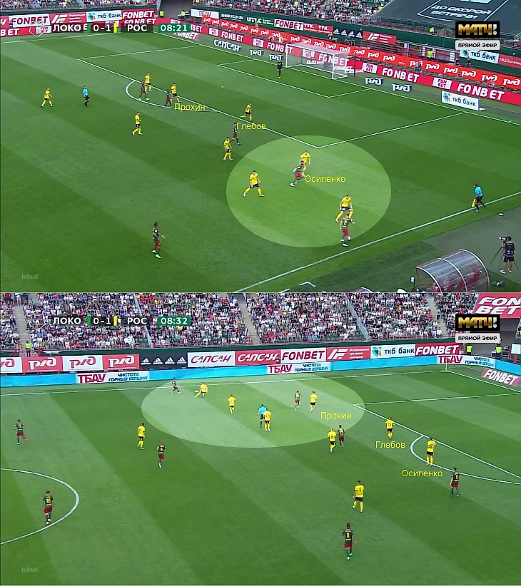 «Ростов» тоже создавал численное преимущество на флангах при обороне компактным блоком. Помогла роль Глебова – Данил спускался пятым защитником, чтобы Осипенко и Прохин страховали крайних защитников при атаках.