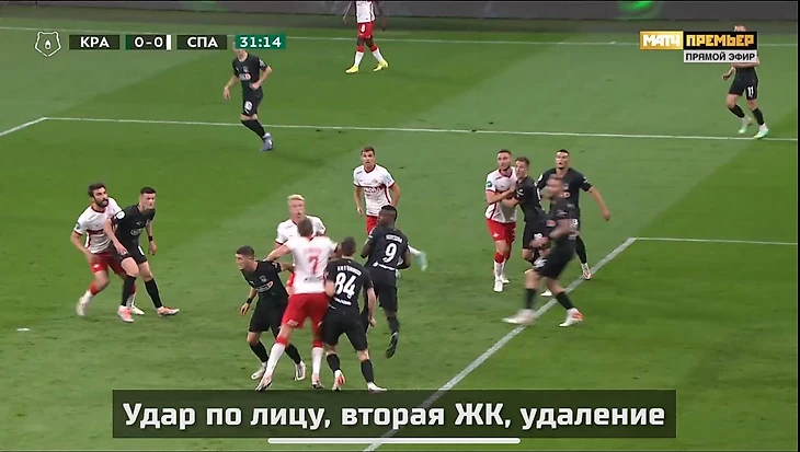 Первая претензия «Краснодара» – по эпизоду, когда Александр Соболев, будучи на желтой карточке, при счете 0:0 попал локтем в лицо Руслану Литвинову.