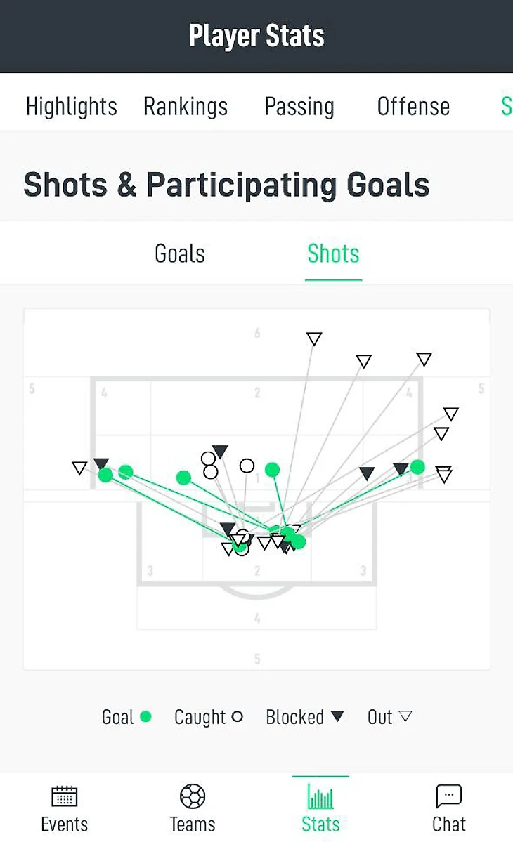 Как раз тут в ход вступает статистика: данные с точек и видеонарезки. С помощью приложения Ollie (прим. — позволяет указать, откуда был совершен удар и в какую точку прилетел) показал, что именно было не так, с каких точек сколько ударов было совершено, процент голов, ударов в створ, кто совершал прострел или передачу, с какой позиции чаще промахивался: