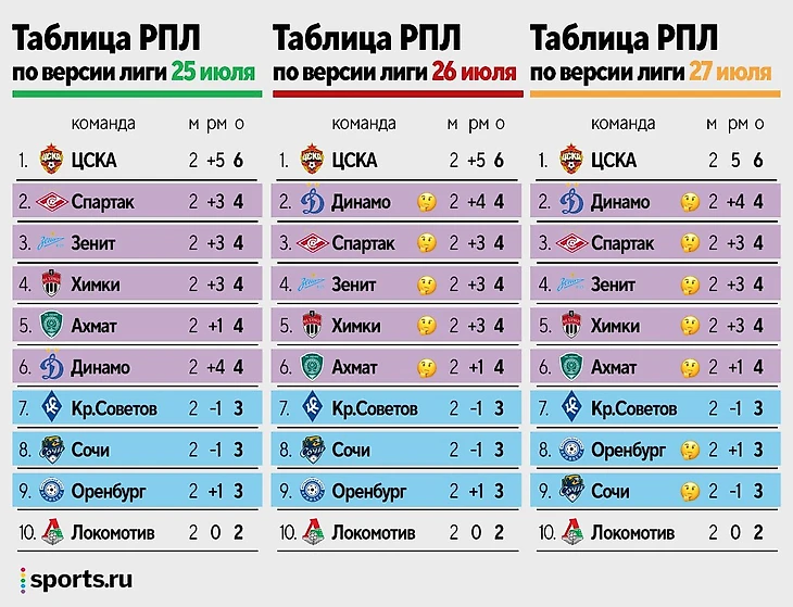 🧑⚖️ Лига странно подошла к идентичным ситуациям. Регламенту соответствовала первая версия таблицы РПЛ, во второй появилась ошибка с позицией «Динамо», в третьей – добавили еще одну.