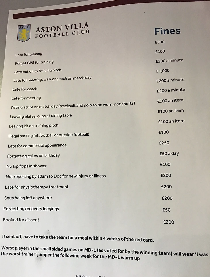 На реддите появился список штрафов для игроков «Астон Виллы» на следующий сезон. Он включает аж 20 пунктов – видимо, главный тренер Стивен Джеррард всерьез взялся за дисциплину.