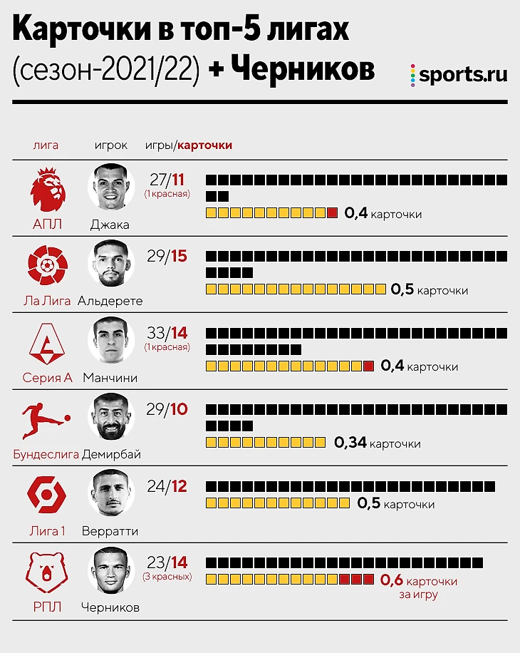 ・Черников – самый агрессивный по проценту карточек. У него в среднем 0,6 карточки за матч (такого показателя нет ни у одного игрока в топ-10 лигах Европы).