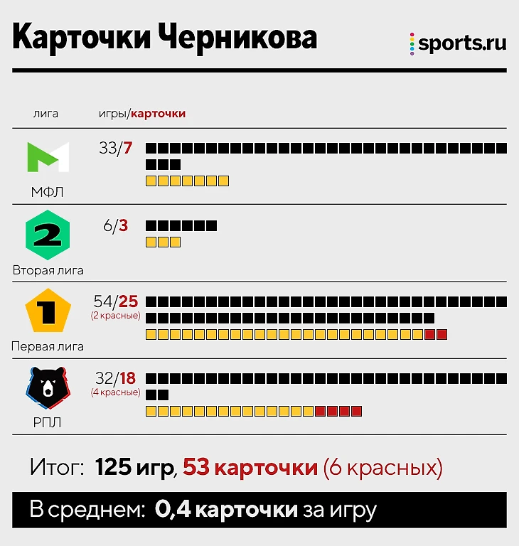 22-летний Черников в прошлом сезоне получил 11 желтых и 3 красных в РПЛ – больше всех в сезоне. За свою карьеру он заработал уже 53 карточки за 125 игр – почти каждая вторая игра с желтой.