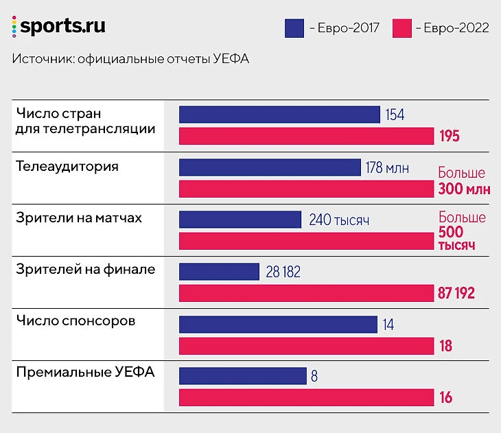 • Турнир транслировался на 195 стран. Евро-2017 посмотрело 178 миллионов телезрителей, сейчас аудитория ощутимо больше.