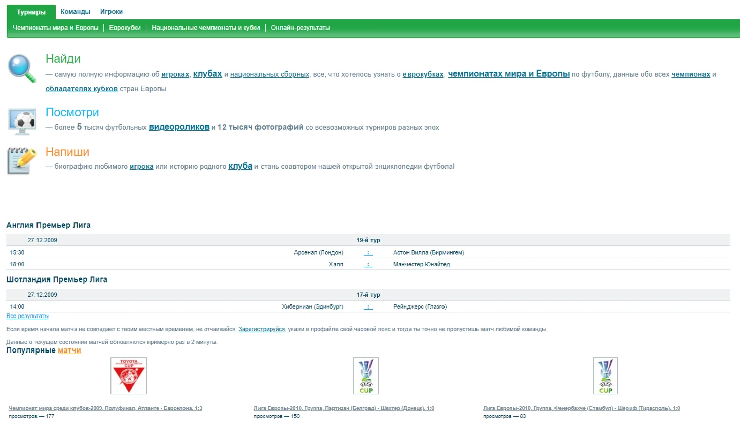 Начинал я, как и большинство пользователей, как читатель. На первых порах сайт имел несколько разделов, такие как «Турниры», «Команды» и «Игроки». На главной странице размещались последние результаты матчей, колонка «День в истории», список самых активных пользователей (он же Fan-сектор) и раздел с последними обновлениями. В дальнейшем появилась возможность добавлять новости, пополнять базу игроков и редактировать добавленные материалы.