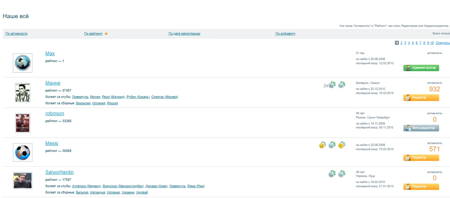 Не могу не сказать несколько слов о тех, кто тратил свои силы и время, обогащая сайт. Увы, их имен я практически не знаю, поэтому вынужден ограничиться никнеймами, под которыми они добавляли материалы. Это, конечно, robinson, EGor, ROM, SalvorHardin (лучший пользователь 2011 года), Sanjamen 99, Манне (лучший пользователь 2012 года), bond, Zakhar, ПавловАлександр1990. Вошел в десятку лучших пользователей FanNet.org за всю историю и мой приятель Станислав Чудин, имевший на сайте ник STANISLAV2310. Он прекрасно разбирается в российском футболе, быстро стал суперзвездой на Sports.ru и завоевал авторитет в области футбола, а ныне ведет Телеграм-канал о футбольной посещаемости. Но Стас прекрасно помнит время, проведенное на FanNet.org: