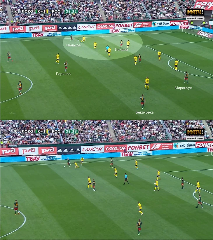 Плюс не было коллективных подстроек – в этом эпизоде Бека-Бека и Миранчук встретились на правом фланге, но вынужденно перевели атаку налево, где Ненахов и Изидор остались против четырех игроков «Ростова» (эпизод закончился передачей назад на Худякова).