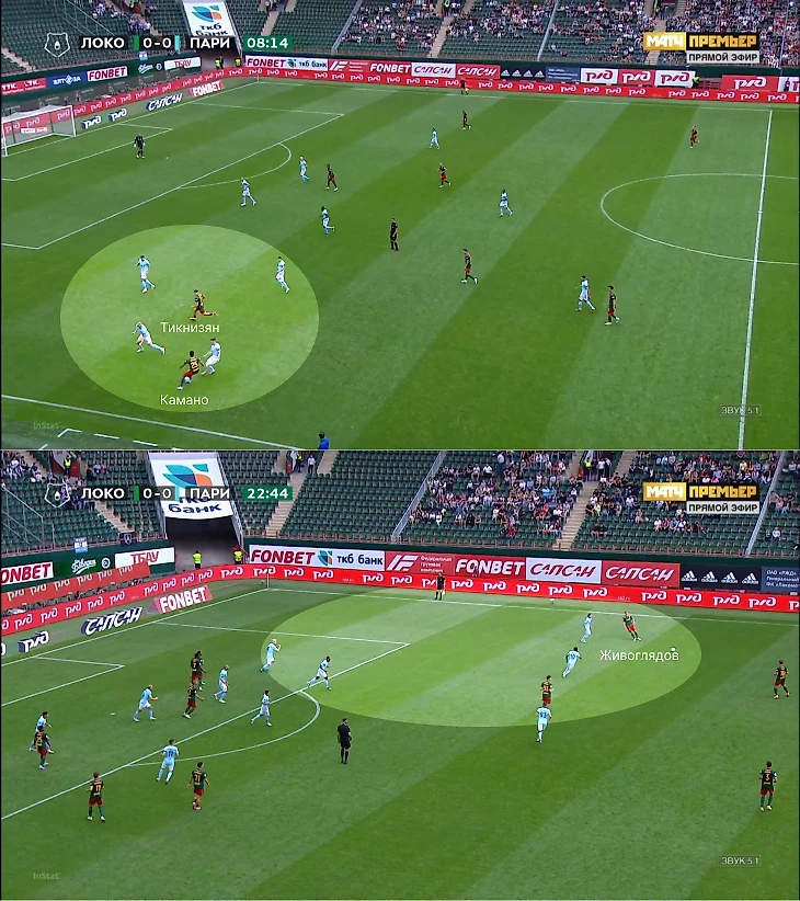 С «Нижним» и «Ростовом» «Локо» практически ничего не придумал для обострения фланговой игры и переходов в середину. Например, роли восьмерок в 1-м туре кардинально отличались: Миранчук обладал свободой (уходил в глубину или на другой фланг), а Баринов врывался на одну линию с Изидором. Но не хватало качественного взаимодействия между защитниками, восьмерками и вингерами – «Пари НН» численно превосходил «Локо» по краям, а в отсутствие привязки Миранчука и Баринова к фланговым игрокам этот эффект лишь усиливался. Итог – «Локо» зарывался на флангах и зачастую просто перекидывал мяч с края на край, когда не видел привлекательных вариантов.