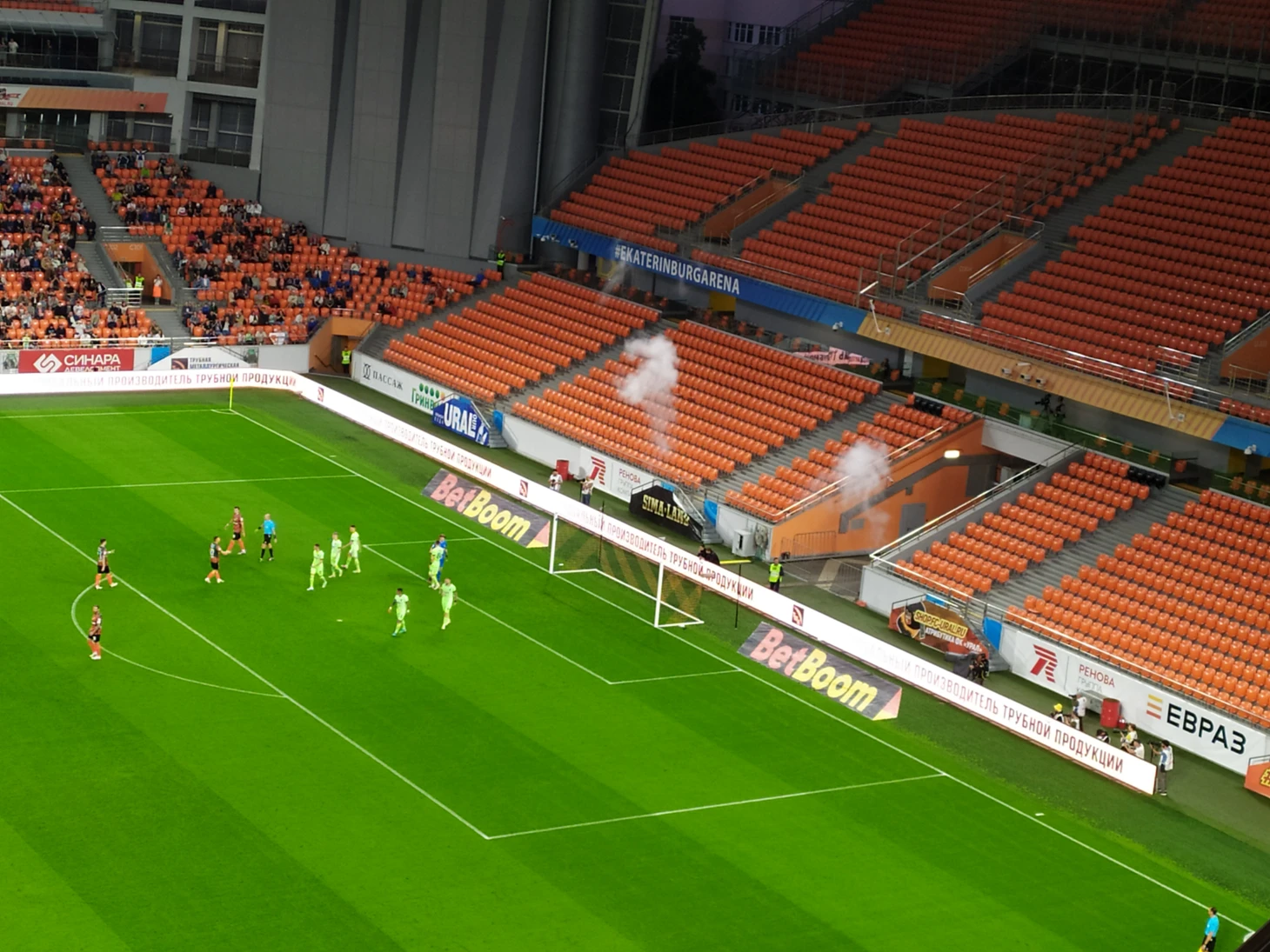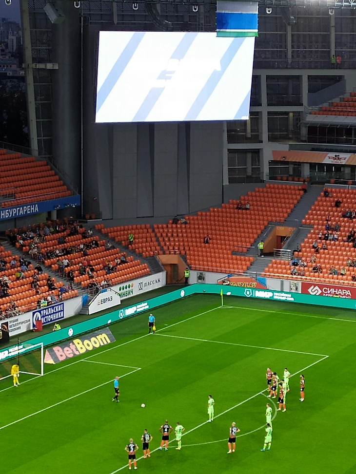 Оба раза Эдуард бил по воротам, за которыми обычно располагается фанатский актив "Урала". Ни флагов, ни баннеров, не поддержки громким хором в форме одежды "по торсу".