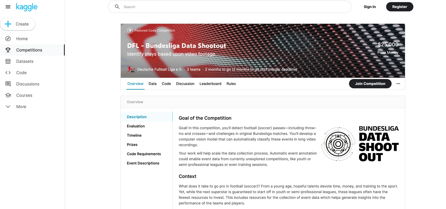 Чтобы автоматизировать этот процесс, пишутся специальные алгоритмы, распознающие действия на поле с помощью видео. Sportec Solutions не исключение, и поэтому в предверии нового сезона Бундеслиги перед Суперкубком мы с нашим отделом подготовили Bundesliga Shoot Out - соревнование по анализу данных на Kaggle - крупнейшей платформе data-соревнований в мире.