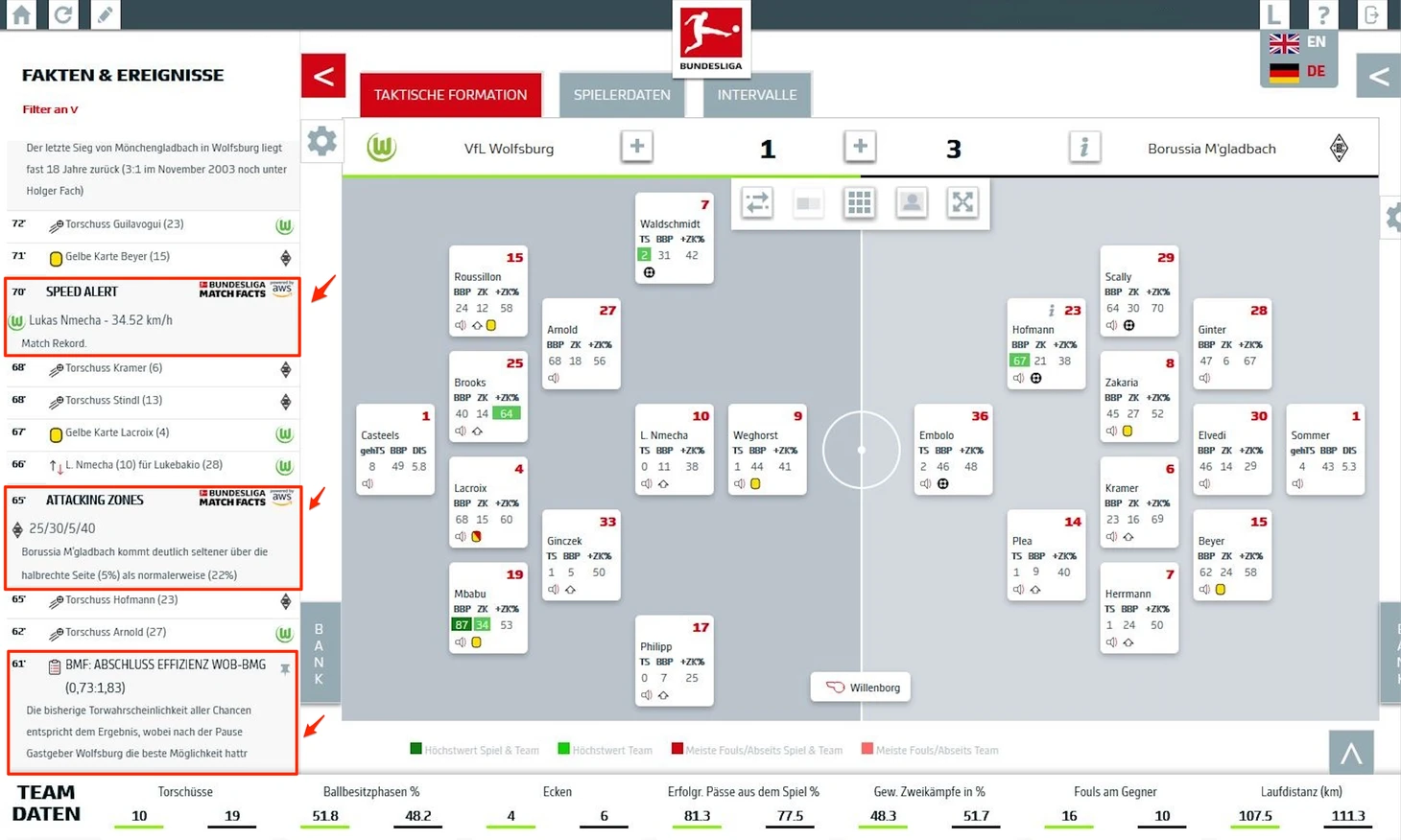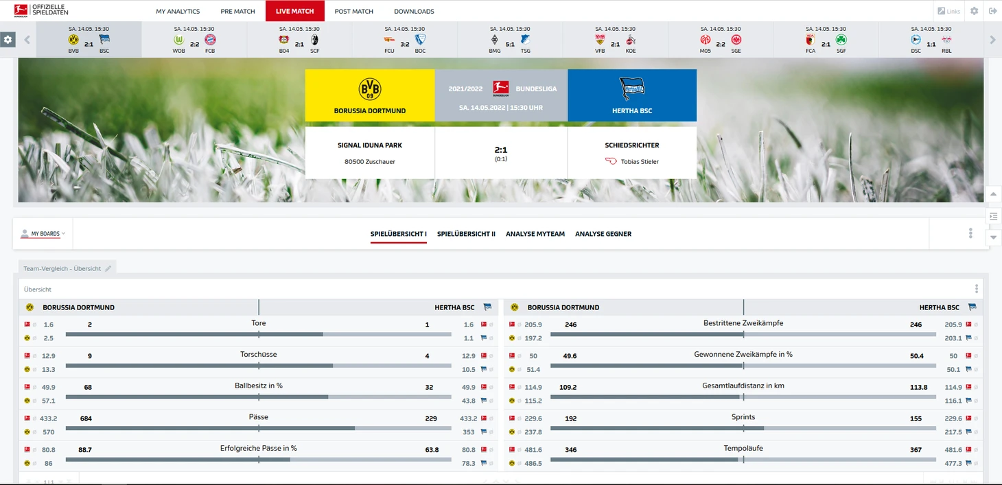 Также Бундеслига делает на основе данных свои продукты - например, 2 продукта, в разработке которых участвует наша команда - Match Analysis Hub и Commentary Live System. Match Analysis Hub - платформа для клубов 1 и 2 Бундеслиг с статистикой по каждому из матчей, доступной до, во время и после матча + хранилищем видео как с картинкой из-за обоих ворот, так и панорамным видом на все поле.