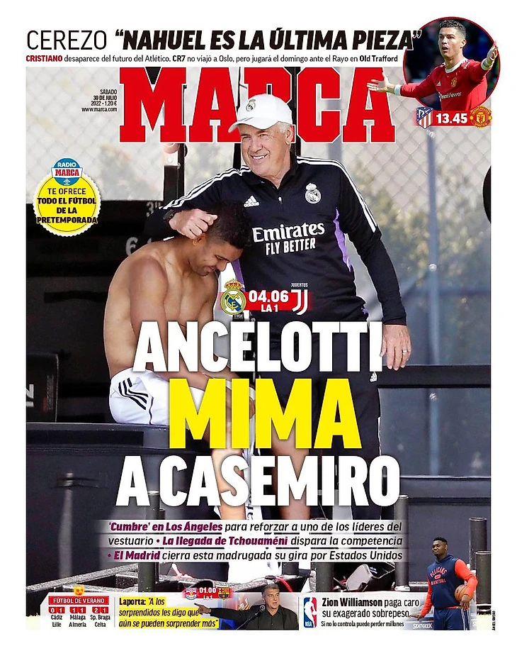 Сегодня на обложке Marca красовалась вот такая фотография с подписью: «Анчелотти вселяет уверенность в Каземиро. Он бесспорный игрок старта».