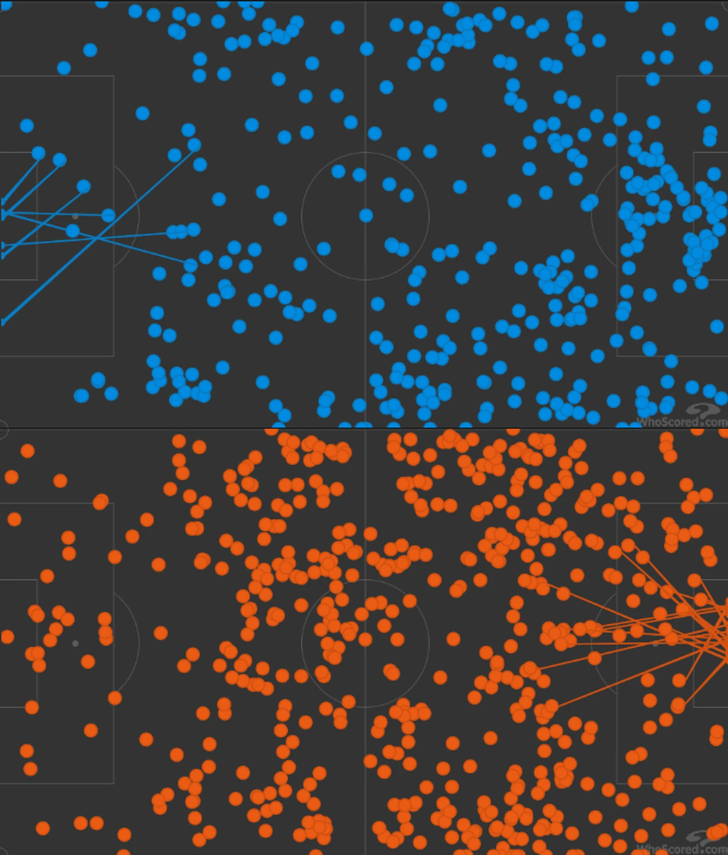 Сверху – активность «Локомотива» до гола Вендела, снизу – «Зенита», данные Whoscored