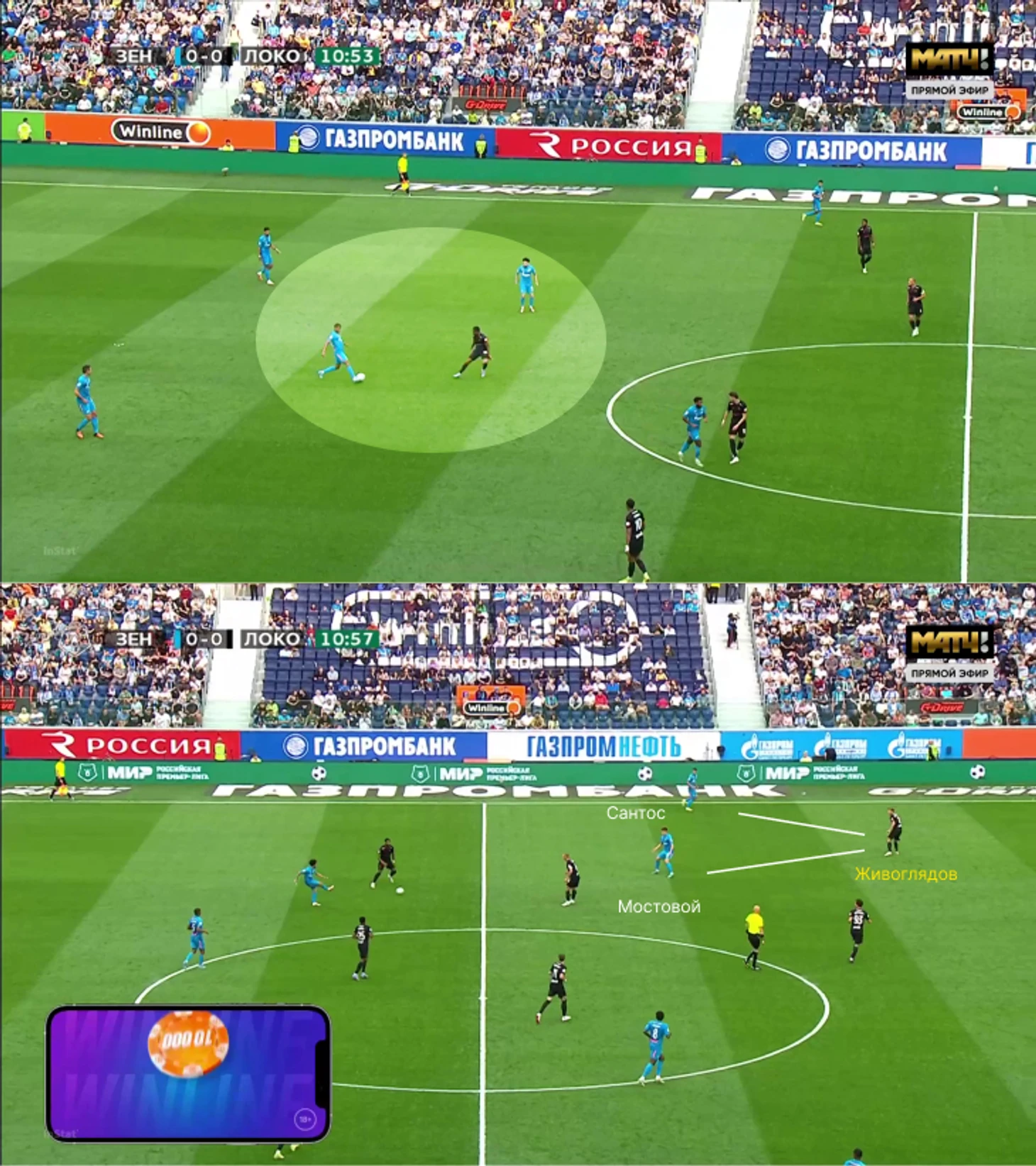 3. «Локо» очень легко сыпался при переводе мяча с одного фланга на другой – «Зенит» без каких-либо проблем делал короткие диагонали правее или левее, чтобы создавать моменты. Хозяева этим пользовались через ширину всей группы атаки. Например, при переходе с левого фланга на правый часто в изоляции оставались Малком или Сутормин. При обратной ситуации так делали Клаудиньо и Дуглас. История усугублялась, когда Миранчук застревал наверху или кто-то из полузащитников не поддерживал структуру.