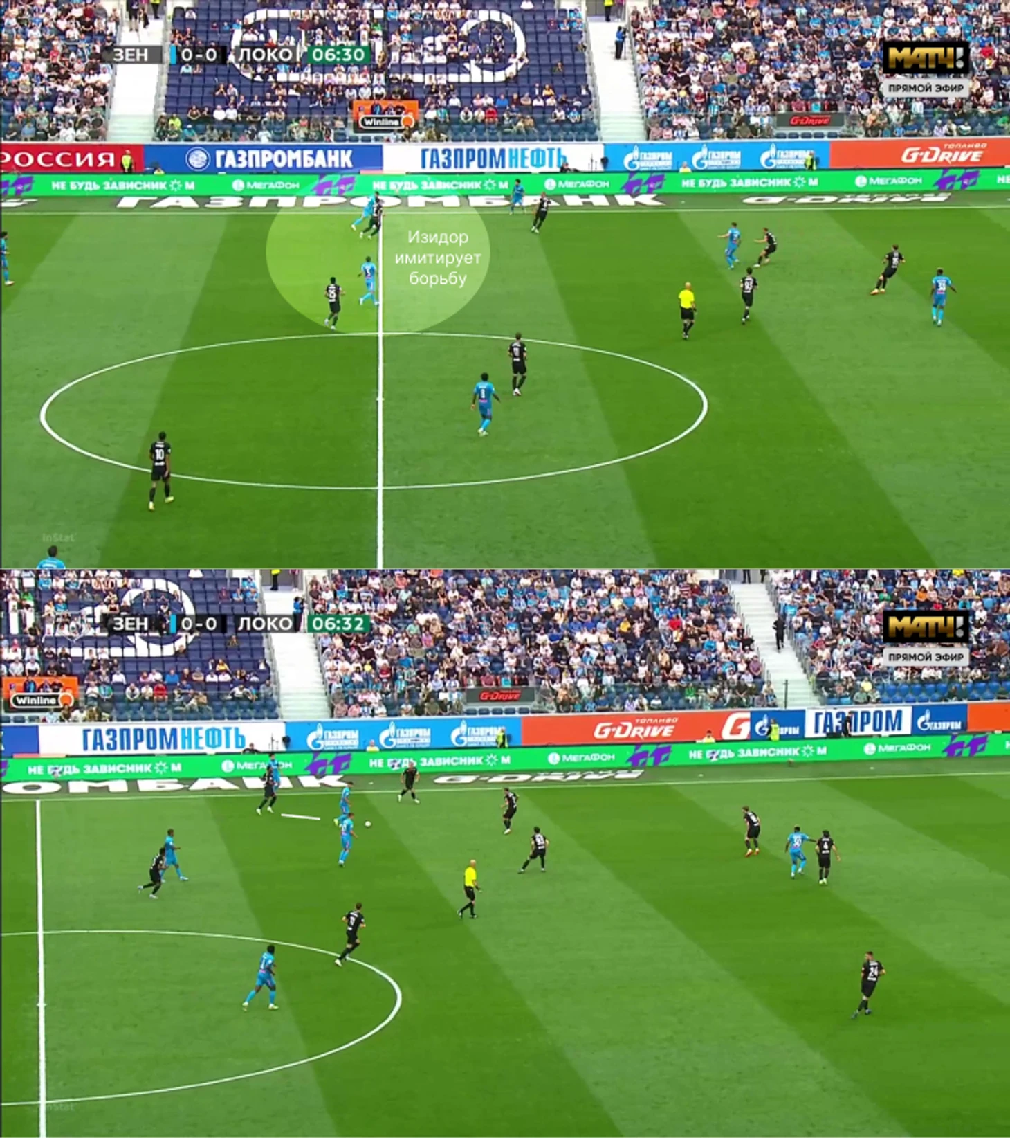 Например, атака с супермоментом Мостового началась со смещения Андрея в глубину: он выманил на себя Живоглядова, отыгрался с Венделом, а затем забежал Дмитрию за спину. В итоге после передачи от бразильца Андрей сместился в глубину, где увидел ширину от Сутормина: сначала Алексей качественно забежал в полуфланге, после чего отыгрался с Малкомом и открылся в свободную зону – атака закончилась опасным прострелом без помехи от защитников (здесь еще опоздал Изидор).
