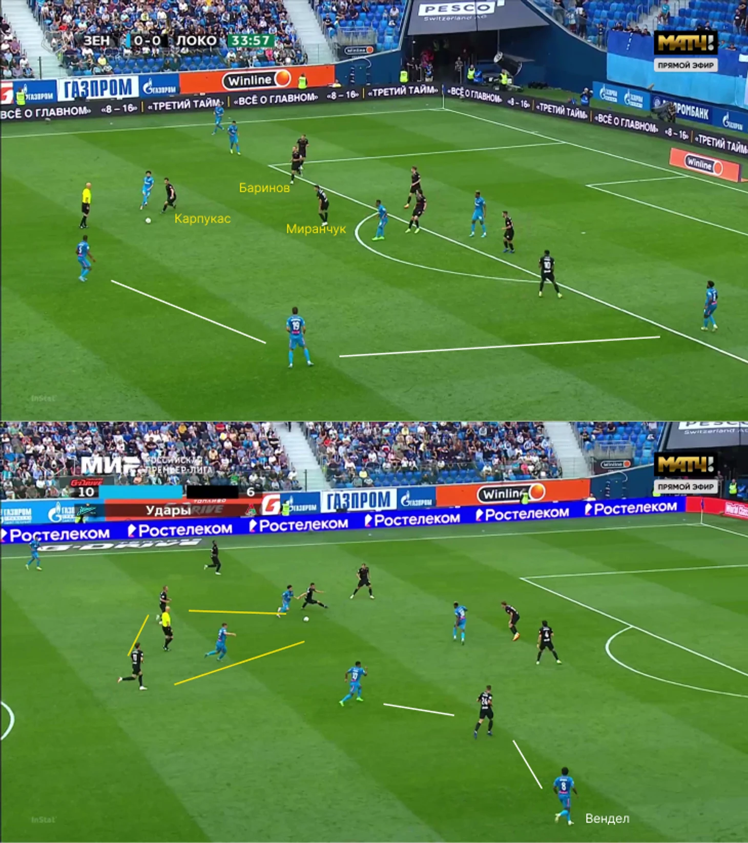 В других моментах «Зенит» тоже пользовался хрупкой структурой «Локо»: в первом случае вынудил Баринова опуститься в глубину (освободил правую зону, заставив Миранчука сесть правее плюс поддерживал ширину), во втором – Клаудиньо воспользовался пространством и обыграл Карпукаса 1-в-1, а затем первел на свободного Вендела.