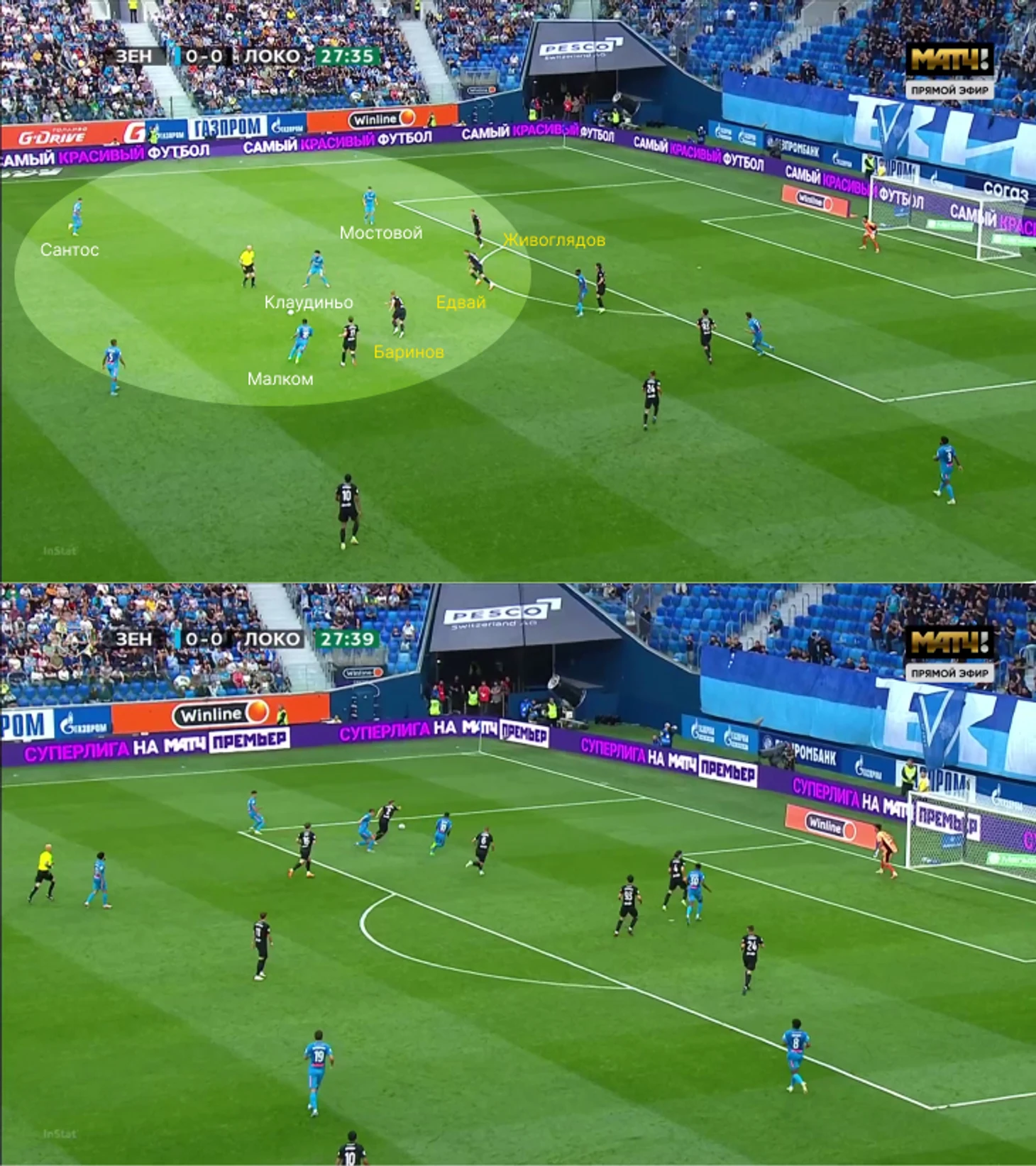 Безыдейность «Локомотива» прослеживалась в выходе из-под прессинга – гости планировали перебивать давление «Зенита», но не создавали удобных условий для подборов и быстрых отрывов. Агрессия «Зенита» была связана с розыгрышами у ворот – команда встречала центральных защитников (зачастую давление оказывали Мостовой и Малком), зоны по центру разбирали Вендел-Барриос-Клаудиньо (плюс Кассьерра мог прикрывать Карпукаса), а защитники опекали тройку нападающих.