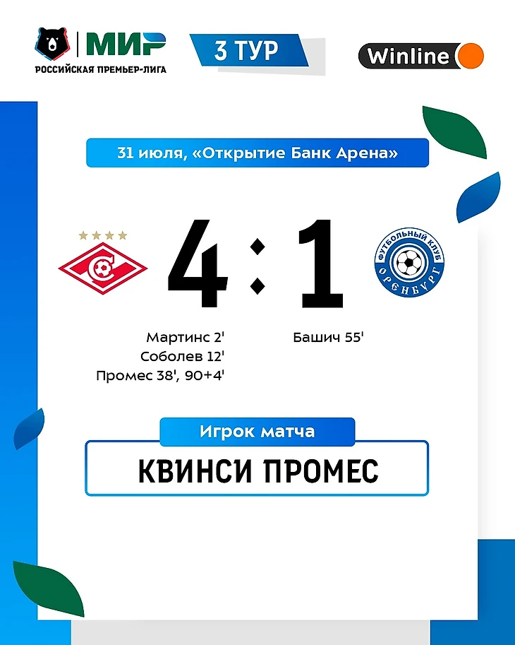 Затем забил Соболев с подачи Промеса, наконец, отличился и сам Промес. Преимущество красно-белых было очень серьезным. «Оренбург» не успевал «читать» быстрые перемещения хозяев поля, комбинационная игра спартаковцев нередко ставила гостей в тупик. Правда, был эпизод, когда при счете 3:0 футболисты «Оренбурга» могли посчитать, что арбитр назначит пенальти в ворота спартаковцев. Но, после просмотра ВАР арбитр не стал этого делать. И справедливо.