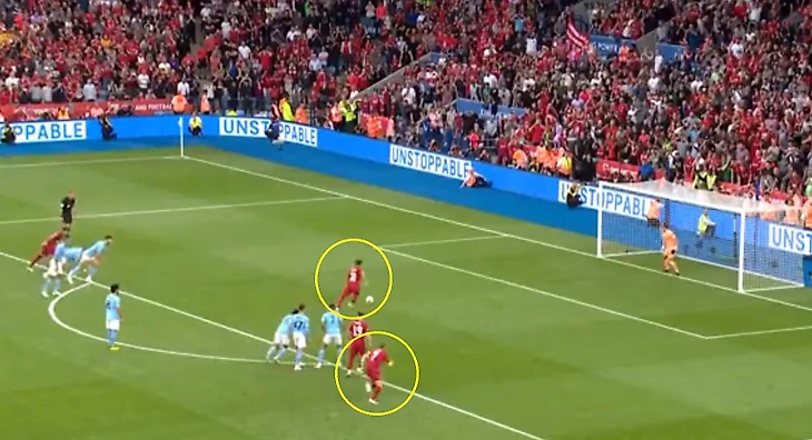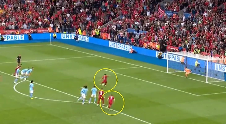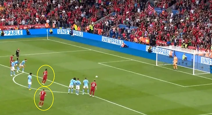 Египетский нападающий уверенно пробивает в нижний угол ворот, а Милнер идеально копирует разбег своего товарища по команде.