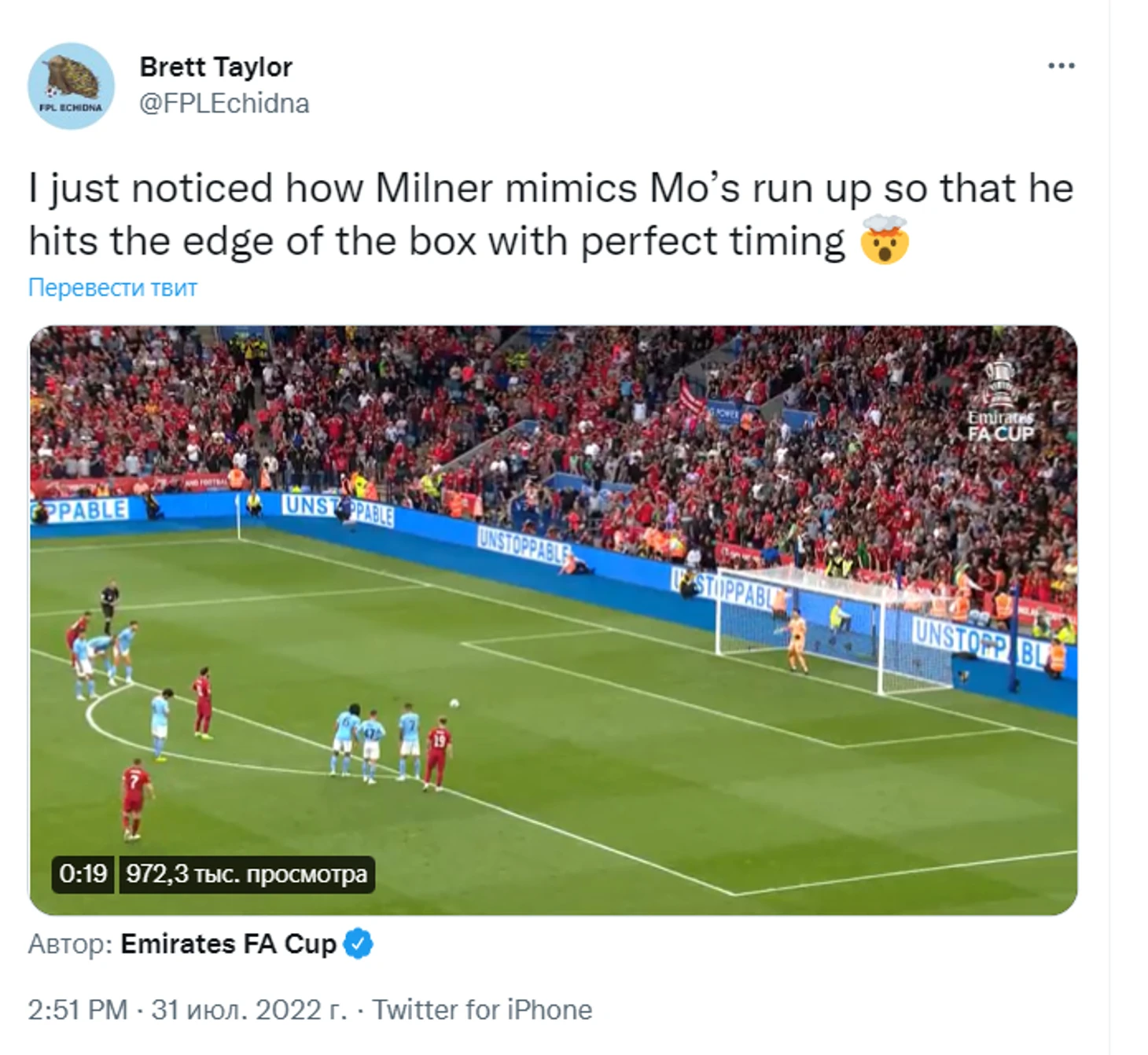 «Я только что заметил, как Милнер имитирует разбег Мо, так что он попадает на край штрафной площади в идеальное время».