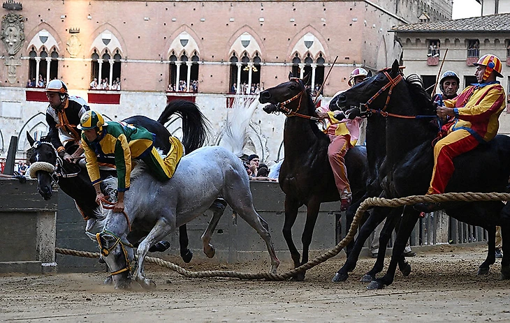 2 июля. Это Палио – традиционные скачки по Пьяцца-дель-Кампо, главной площади Сиены. Первые состязания начались еще в Средневековье. Фальстарт у участника в белом.