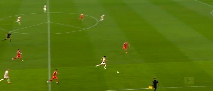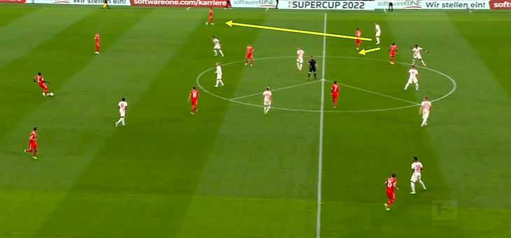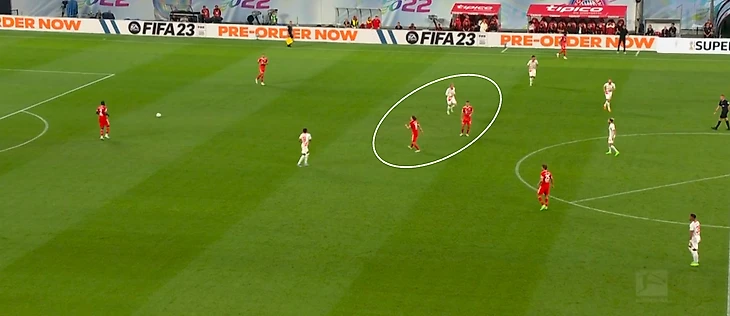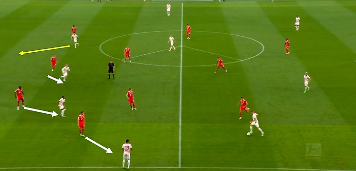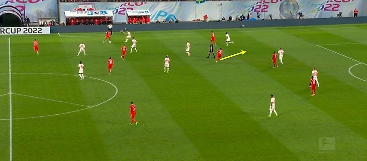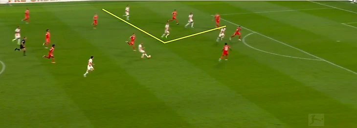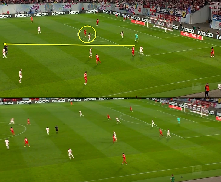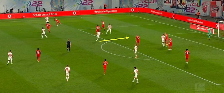При этом команда Тедеско трансформировалась в 5-2-3, чтобы минимизировать риски в последней трети поля и создавали численное преимущество против четверки атакующих игроков, к которым регулярно подключался Дэвис. Клостерманну была выдана сложная роль, так как он должен был переключаться на Дэвиса, если он забегал, при этом только в случая, когда центральные защитники были готовы к передаче соперников (т.е Симакан держит Мусиалу, Орбан забирает Мане, а Халстенберг подстраховывает и следит за Гнабри)