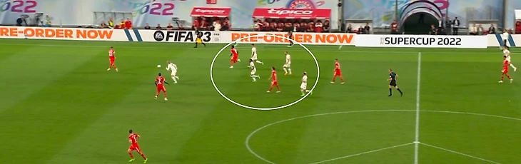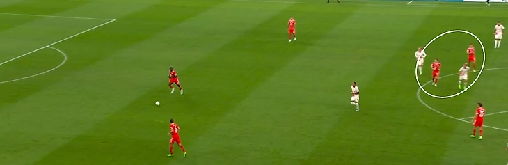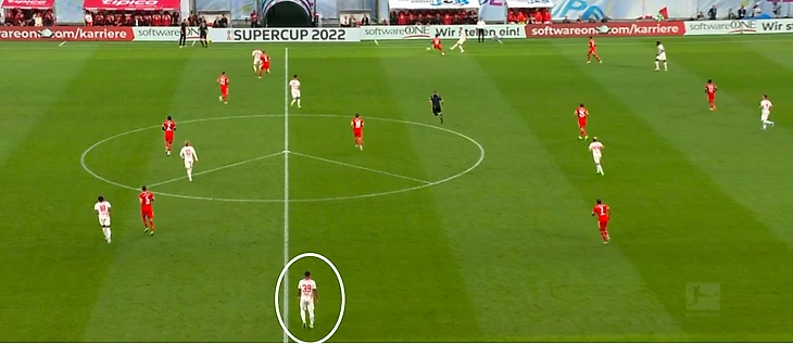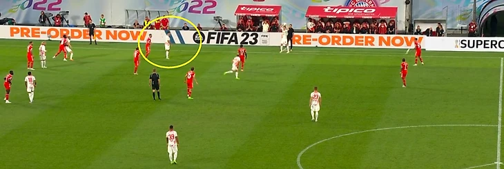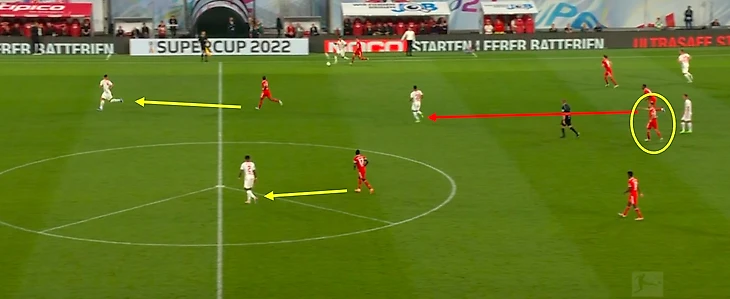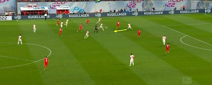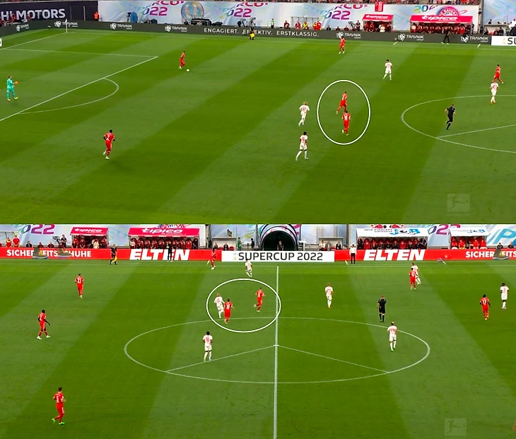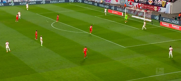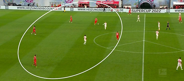 На моменте из матча ниже, Нкунку прессингует Нойера и закрывает воможность передачи на Упамекано, Зобослаи между Эрнандесом и Дэвисом, остальные действую один на один, что вынуждает Нойера отдавать пас на Дэвиса с дальнейшим забросом на атакующую тройку. В этом случае Нойер делает пас на Мюллера через коридор, который образовал Киммих уведя из центра Ольмо. Круто, но пожалуй вернемся к Лейпцигу.
