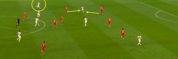 Как можно увидеть на следующем фото против 5 баварцев, готовящихся к прессингу, Лейпциг перестраивается на 4-2-2-2 с Орбаном как центрального полузащитника, что дает численное преимущество 7 против 5 с Гулачи, который активно участвует в развитии атак, что разбивает прессинг баварцев.