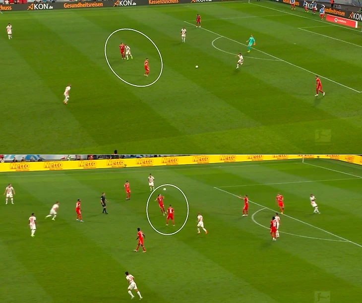 Что стоит отметить, так это то, какой план по обороне использовал в матче, когда баварцы начинали атаку впятером на своей половине поля, то Лейпциг, который не хотел рисковать и идти в прессинг выставлял двух нападающих против двух центральных полузащитников, а чтобы Бавария не выходила из обороны через фланги на правом фланге персонально против Мюллера играл Хенрикс, а Дэвиса и Мусиалу передавали друг другу Зобослаи и Клостерманн.