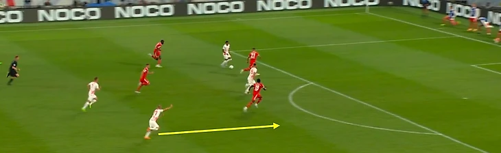 В отличии от Баварии команда из Лейпцига строила свои атаки, в общем и целом, симметрично. Разберем роли каждого, тут это необходимо. В зависимости от фланга через который строилась атака крайний защитник Хенрикс или Клостерманн делали небольшой рывок, чтобы привлечь внимание Дэвиса или Павара, которые реагировали на это и уменьшали расстояние с прямым оппонентом, одновременно с этим 2 из 3 игроков двигались в зону между защитниками и полузащитниками, что вынуждало уже крайних защитников подниматься выше. Образовывая свободное пространство между линией защиты и вратарем, Лейпциг отправлял туда третьего игрока, который должен был обработать навес из центра поля.